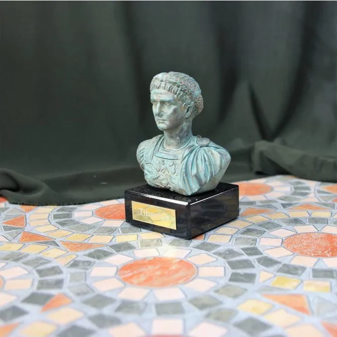 Deze buste is een replica van een nuste van keizer Tiberius. Het origineel maakt deel uit van de collectie van het Archeologisch museum van Napels. Vaak werden deze beelden beschilderd om ze levensecht te laten kijken.