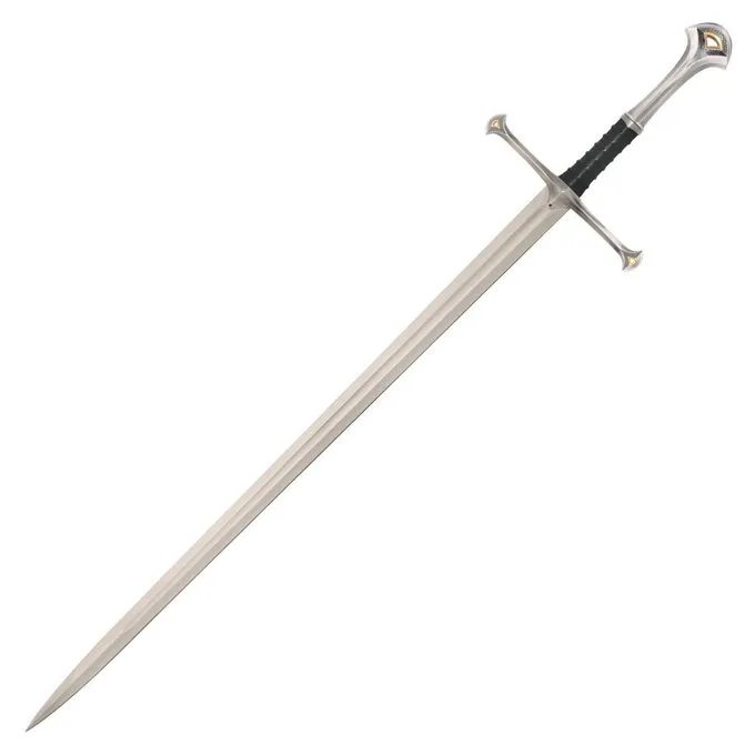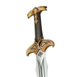 Narsil is misschien wel het beroemdste zwaard in de ‘Lord of the Rings’ -trilogie. Aan het einde van het tweede tijdperk van Midden-aarde werd het mes van Narsil verbrijzeld toen Eldil viel tijdens de laatste alliantie van elfen en mannen in de grote strijd tegen Sauron. Isuldur, de zoon van Elendil, gebruikte vervolgens het gebroken handvat van Narsil om ‘The One Ring’ uit Saurons vinger te snijden, de banden van zijn kracht te breken, zijn slechte schaduw in de duisternis verbannen. Kenmerken omvatten antieke verzilverde metalen handgreeponderdelen met 24-K vergulde fittingen en echte met leer gewikkelde grip. Gegraveerd op de pommel zijn runen in de Elven -taal van Sindarin die zeggen: ‘Narsil is mijn naam, een machtig zwaard – Telchar maakte me in nogrod’.